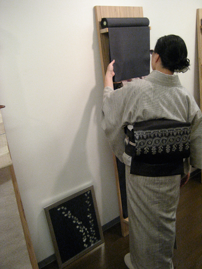 着物は経緯(タテヨコ)真綿紬糸で、江戸小紋の千筋程に縞を織り上げたものです。 真綿糸なので当然、節がありますし、経て糸も真綿糸ですと大変織り辛いものです。 しかし経て糸を生糸にするよりも、はるかにしっかりとした織物として出来上がります。高機の手機ですが、打ち込みもしっかりとしてあり、ふんわりと身体を包んでくれる着物ですね。 帯は仁平幸春氏作のレース柄の染め帯。 画像では分かりにくいですが、生地は金通し生地。地色は墨色です。 更紗の柄は、とても長い年月をかけて和服の柄と使われるようになりましたが、 仁平氏が提案する西洋レース柄の和用は、更紗において掛かった年月を、見事に短縮して現代の我々に見せてくれています。 300年以上の歴史のあるレース柄が、このように見事に和服の柄で開花しているのは、仁平幸春氏の作品の他に見当たりません。 帯締は和小物さくらさんの新作。帯揚はさくらさんの草木染め無地。 全体にとけ込みながらも、その上質さからくる目の留り所となっています。