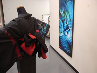 ゴトウヒロシの新作 4月始めから1ヵ月間、六本木のギャラリーBAR『OPA』で、秘かに開催されていたゴトウさんの作品、『空』、モデルは『呉服なか志まや』展、インターナショナル家庭画報の表紙、ポーラ化粧品、などなどの『有規衣/ゆきえ』さん、ゴトウさんに無許可でお見せします。 だって、今日は個展の搬出日、なのに当の御本人は、とおい パリ、、、、、この後が、芸術家クマさんの作品展なので、僕と書家の大場さんで、ゴトウさん作品の撤収、、、、です。 そのついでに、クマさんの作品の陳列のお手伝い、そこに、 携帯に『通知不可能』の表示とともに、『ボンジュール!』 通知不可能の国際電話です、みなさん御存知でした? でも、100展以上のクマさんの作品に触れながら、その展示をお手伝いするのは、とても楽しい時間でした。 クマさんとは、ゴトウさんの個展初日に、このBARで、随分親しくお話させてもらったのと、トークのポイントが妙に合ったので(そう感じました、僕は)今では、ダチなんです(笑) 夏祭りの屋台のような賑やかやがある、作品になんかうきうきしました。このBARは、デザイナー/作家/etcの方にとっては、普通のギャラリーとは違う、何か特別な処のようです。ある意味ステイタスであり、厳しい批判のさらされる処であり、集まる方も様々な業界の一流の方がいらしているようです。 ある意味、ゴトウヒロシを誇らしく思うのと同時に、呉服屋の自分が、こういう場所で、きものに関係あるような、ないような不思議な環境にいれる楽しさを味わえました。それは、岡さんの作品の展示のお手伝いをさせて頂いた時にも、強く感じました。 昨年の『呉服なか志まや』の浴衣をボディに展示するのと同時に、二人で釘を打ち、パネルを組み立てながら、一つの空間を組み立てていく楽しさ。そして、その出来上がりに満足感を味わえる、その瞬間。 デザイナーであろうと呉服屋であろうと、同じレベルで語り、もの創りしていく楽しさは、人間を幸せにするものだと確信しました。 ゴトウ、岡、そして一衣舎さんの個展にここ数日間たずさわり、一番感じたことでした。