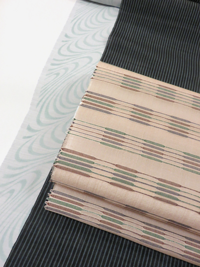 着物 微塵縞風通織お召単衣 なか志まやオリジナル 帯 勝山健史 レース華文 仕立 着物、帯ともに一衣舎製 帯締 笹波組 帯揚 絽ちりめん ともに和小物さくら 『畳紙を開けた瞬間に凛とした、緊張感のある仕立て上がり!』それを感じて頂きたいというのが、なか志まやの願いです。独立してから24年、『これは!』という仕立てものは全て一衣舎さんにお願いしています。 なか志まやのオリジナルとして制作したこのお召は織司なかむら製、あと2反だけで、機屋からもう織れないと言われています。画像からは伝わりませんが、極細の縞を織り出したお召で袷にも勿論良いですが、単衣にして頂くと、その生地の適度な薄さ、ドレープ感がとても美しい着物になります。 勝山さんの帯は、単衣から夏に締めて頂く組織で織った、塩蔵繭使用の名古屋帯。夏には紋紗や絽の染めの着物にも合いますね。 すっきりとしたコーディネイトにする為に、小物も無地で合わせて、着物全体のトーンをまとめて爽やかさを出しています。