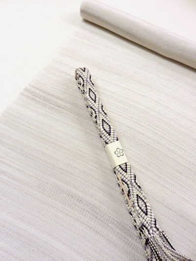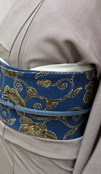 撮影した画像だと、綾織された地紋がよく見えませんね。。。残念。 最近のマイブームがありまして、帯揚の色を濃いものを入れる!というものです。おそらく統計をとると、自分の仕事では、帯揚は圧倒的に薄めの色が多かったように思います。 着物と帯の橋渡しが帯揚の役割であり、準礼装クラスまでのスマートカジュアルと呼ばれる装いを作る場合、着物の色よりも薄めの色を、帯揚でお薦めすることが多かったと思います。共薄系はまず間違いないので安定していますが、帯締ではなく、帯揚の方に濃い色を持って来る装いを、ここしばらく好きになっています。 わたしのような、着物に絵柄をあまり必要としない、無地感覚の着物を多く取り扱い、同系色の濃淡で、布の質感重視のコーディネイトをする呉服屋にとって、ここの部分は(帯揚の色)非常に重要です。 今まで通り、帯締と帯揚の色が反対でも良いと思うのですが、今はこのイメージの方が自分の気分に沿っています。 また『礼装になればなるほど、着物の装いの色数を整理する、またはすべて同じ方向に向ける』というのがわたしのセオリーですが、画像は光沢感のある綾織の着物に、意匠が軽過ぎない帯、装いの色合いがすべて2色程にまとまっているので、多くの人が洋装でいる今の時代に、一番ニーズが高い着物姿になると思います。