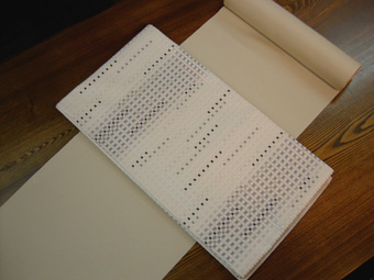 所謂、、、、特選の袋帯ですw 西陣のここの織元は、とてもいいものを創られますが、高い!呉服屋さんでいう 逸品の袋帯でござ〜います。 一昨年、振袖の帯を探して西陣まで足を延ばした時、何かの縁で迷いこんでしまった帯屋(名は伏せておきます) 前回はビロードを織り込んだ幾何学的な帯(このHPの何処かに画像があります) でしたが、今回は、すこしアースカラーを意識した帯です。 袷の帯ですが、地が羅織りされているので、カラー芯を使い、着物とのコーディネイトや帯そのものの印象を変えながら、楽しむことができます。