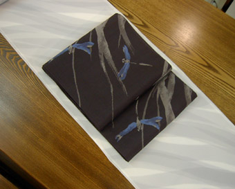 ●2004年06月03日(木) 風、太陽、月ときたので、、、 とんぼです!て、なにも繋がらないようですが、ここまで来てもまだ、草花がでないところがなか志まやらしい。いや、草花柄の帯もきものもないんです、、、 麻の本袋で、色と柄の取り合わせが素敵です。いままで、八寸、四寸と角帯はよくおみせしましたが、今回はじめてその織元の上物?を入れました。 考えなくても、夏は夏だけ!袷の着物や帯の時みたいに、秋、冬、春を同時にかんがえなくてもいいし、こってり夏をねらったものもいいですよね?