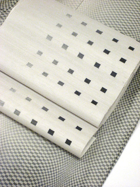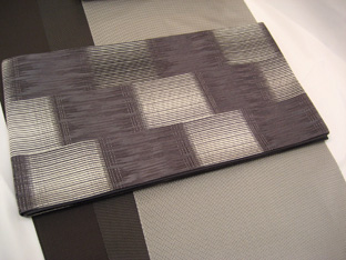 2006 秋冬 なか志まやスタンダード 着物や帯にメタリックな光沢感が欲しいと思い始めるきっかけとなった 米沢の織の着物。この着物は市松柄が少しずつ形が変化して、裾からと脇からの 濃淡が絵羽になって織り上げられています。 少しずつ暈しにい位置と色を変えて、毎年のようになか志まやのラインナップに 登場しています。 朱珍織の洒落袋帯は、メタリック感をさらに高めてくれます。 定番のお召しにもよく合い僕の好きな素材の一つです。 着物も帯も同系の濃淡でコーディネイトされて、まさに洋服感覚です。 黒のパーティー着が多い中で、誰よりも知的で洗練された女性に演出して くれること思います。