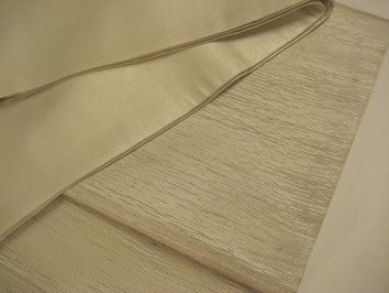 なか志まやオリジナル配色、縞七段グラデーションが出来上がって来た!この程度の画像だとよく分からないかもしれないけれど、お召緯を同色で、紋の違い、つまり縞の太さを変えてみたのだ。 通常は緯糸を色を変えて、紋の違いを際出させる方が当たり前の考え方なのだが、あえて同色で織ってみた。画像上の方が、裾の少し太めの縞で画像下は、江戸小紋の万筋並に細い縞が織り出されている。裾から肩山にかけて七段階に縞を細く織り上げて行くのが新作の絵羽お召だ。10月の時点で3柄にプラス2柄、オリジナル配色として加えてみた。 荷を開けた時には、地味過ぎるというか、自分のねらった効果が顕われていないのかと心配になった。織元の配慮で若干の濃淡を付けた緯糸を使った方が、今まで通りで完成されてよく見えたからだ。 衣桁に掛けて、その裏のパソコンのある机からなにげに、このオリジナル配色の衿のあたりを見て、驚いた! なんともいえず、滑りとした艶があるのだ。 肩から6寸5分強の万筋以上に細く織り上げられた縞が、地味な色を別なものに見せている。もう一度、衣桁に掛かった着物をじっくりと眺めてみると、確かに光の反射で太さの違う縞が微妙に浮き沈みして、なんとも深みのある色合いに見える。 帯などは、特に立ててみよ!というのが鉄則だし、今まで扱って来たお召は当然そういう特性があるのは十分に承知していたけれど、同色の緯(ぬき)を使い、紋で差をつけるという試みは、瞬時に伝わるものではないけれど、じわじわとその妙を感じられる織物になったと思う。 無駄に思えた・・・でも今は、なんとも味わいを感じる。 画像よりも落ち着いた地色なので、どんな着手の方がいらっしゃるか想像がつかない。白髪の女性・・・そういうイメージもある。 男性的な着物でもある。男ものといっても不思議はない。 かっこよさというより、落ち着きがあるのだ。一見は硬さを感じる質感なのだけれど 眺めていくと、じわじわ柔らかく溶け出していく、その一歩手前で留まる。 そういう着物が織り上がりました。