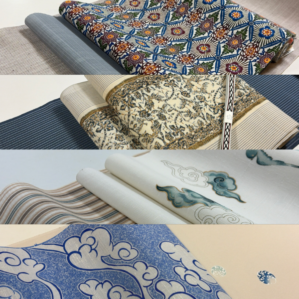 袷、単衣、夏と様々な素材と色柄が集まるこの季節。薄絹の生絹から駒撚りの真綿、大麻や藤などの自然布、そして組織も平織から綾織、そして絣ものと様々な染織布が糸や織を変えながら揃っています。